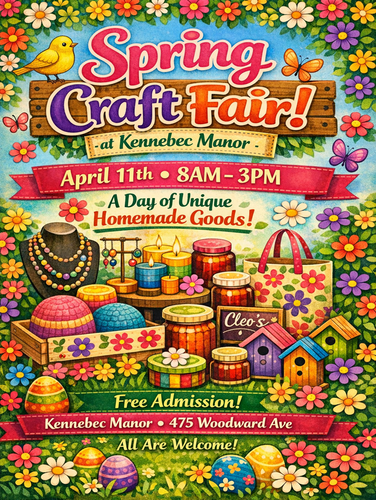 Kennebec Manor is hosting a Spring craft fair on Saturday April 11th from 8-3p.m. Come check out some unique homemade goodies!