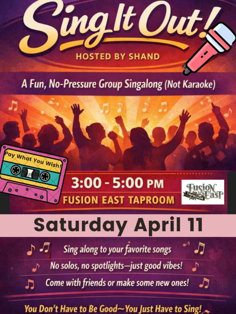 Fusion East Taproom Sing It Out: 90s Throwback Edition Saturday April 11 3-5pm90s THROWBACK is coming to Sing It Out If you ever sang into a hairbrush, burned CDs, or … Continue reading Sing It Out – Group Singalong