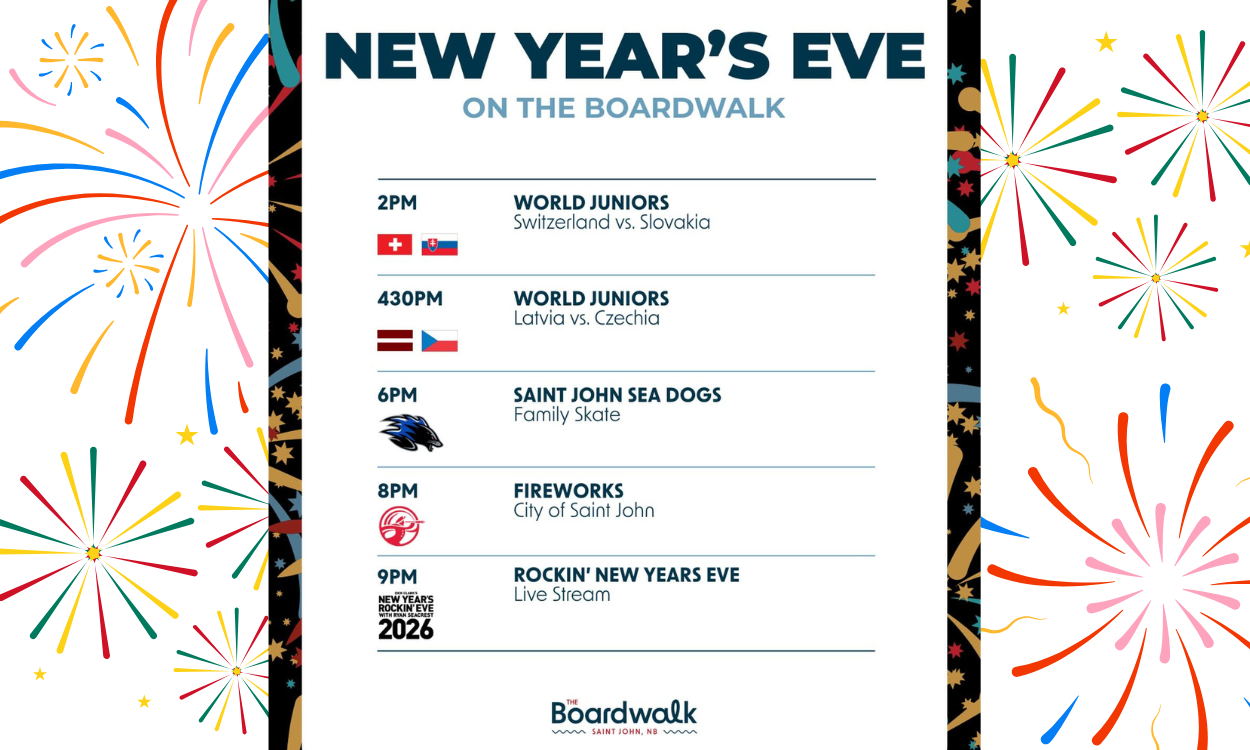 New Year’s Eve on the Boardwalk See you there! 2PM WORLD JUNIORS Switzerland vs. Slovakia 430PM WORLD JUNIORS Latvia vs. Czechia 6PM SAINT JOHN SEA DOGS Family Skate 8PM FIREWORKS City of Saint John 9PM DICK CLARKS NEW YEAR'S ROCKIN' EVE WITH RYAN SEACREST Live Stream